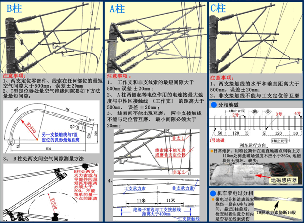 3)测量两悬挂间的空气绝缘间隙是否符合要求(锚段关节内的定位支撑、吊弦载流环、电连接、斜拉线)。