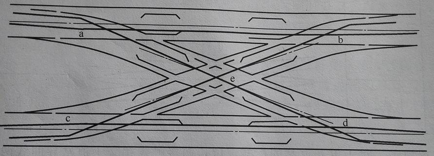 相邻的两条正线或主要站线用专设渡线连接起来的称为交叉渡线。它由两条线和四组单开道岔组成。对于接触悬挂则设五组线岔,如图中的a、b、c、d、e所示。对于常速道岔的要求是:第一首先要使限制管嵌住的接触线能自由伸缩、纵向移动;第二是考虑到温度变化,在调整时,以平均温度计算,侧线接触线应在限制管中间;第三要考虑到限制管、线夹以及双悬挂的集中重量,两接触线应相交于两渡线中心线的正上方,且侧线接触线高出正线(或较重要线)的接触线10~20mm;非工作支要按照设计要求抬高。