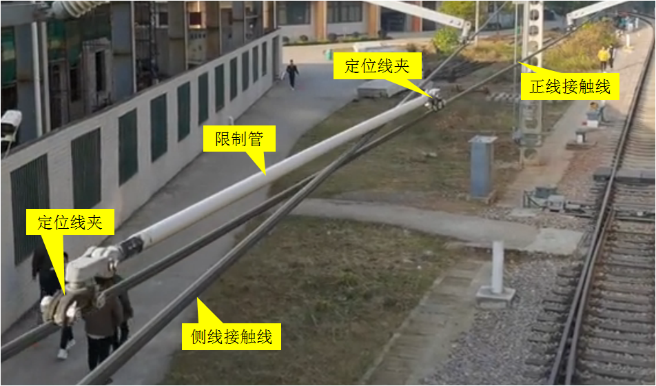 1.限制管 2.定位线夹 3.正线接触线 4.渡线接触线 5.螺栓