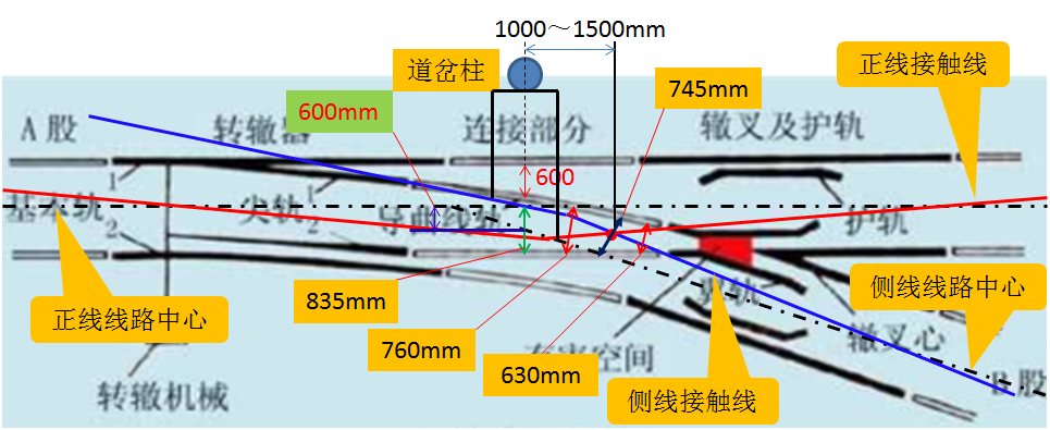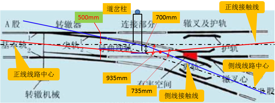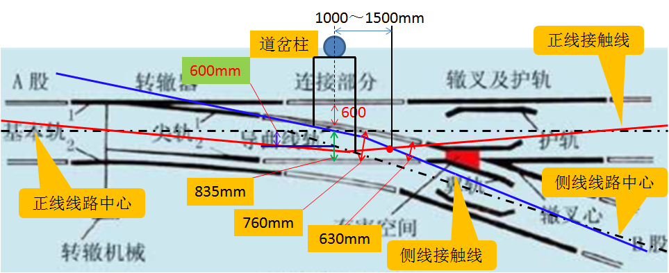 施工检修中规程规定,对于单开道岔的标准定位,两接触线相交于道岔导曲线两内轨轨距(即岔心轨距)630mm至760mm的横向中间位置处,其对横向中心线(即辙叉角平分线)误差不得超过50mm,标准定位时道岔柱中心位置应在道岔导曲线外轨外缘至基本轨内缘为600mm的延长线上,如图所示。
