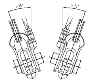 (3)交叉吊弦接触线端的吊弦线夹螺栓及导流环应朝向远离另一支接触线的方向,线夹倾斜角最大不得超过15°。