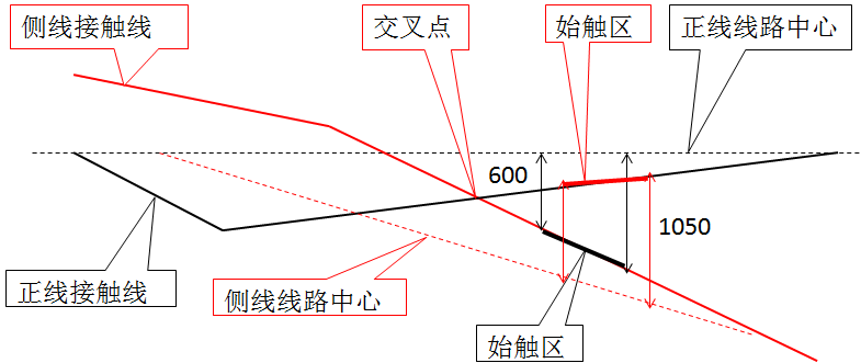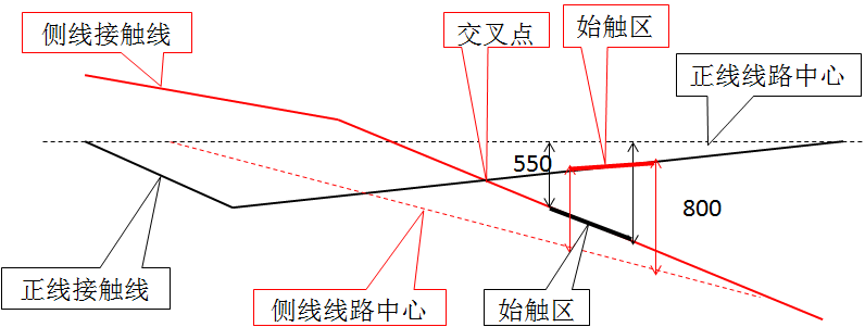 在始触区至接触线交叉点处,正线和侧线接触线应位于受电弓中心的同一侧。