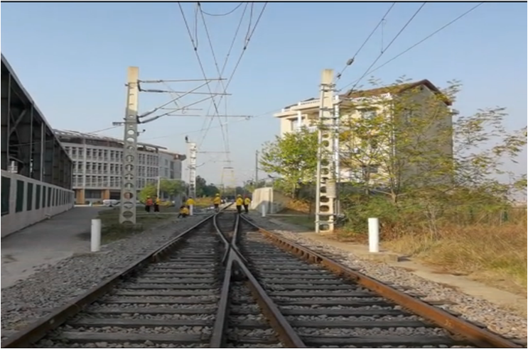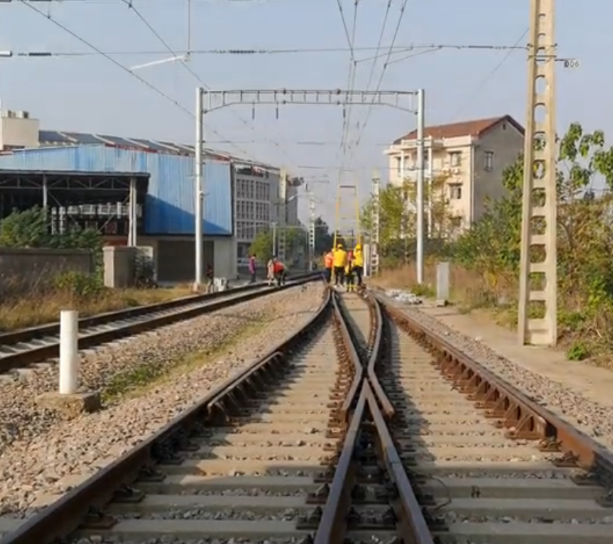 (2)用划线标记正线接触线并位于两内轨距合适位置(即160km/h 及以下区段在两内轨相距630-1085mm 以内、160km/h 以上区段在两内轨相距735-1085mm以内),然后调整该线线岔定位拉出值,直至横向中心位置符合要求。