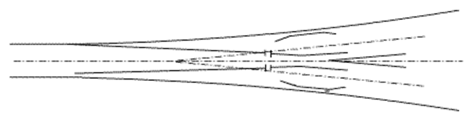 在高速接触网设计中,由于道岔侧向通过速度的提高,接触网在道岔处无论采用交叉式还是无交叉式,均有了更高的要求,因而不能再简单地利用“标准定位”和“非标准定位”方式对道岔处的支柱和悬挂进行布置,而应通过确定一些明确的概念来进行精确的布置。在设计中应该明确接触线、悬挂支持装置与受电弓的几何位置,从而保证受电弓在岔区安全、平滑、无障碍地通过。