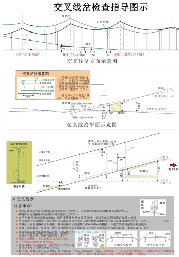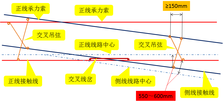 (2)交叉吊弦的安装顺序应保证在受电弓从道岔开口方向进入时,先经过侧线承力索与正线接触线间的吊弦;