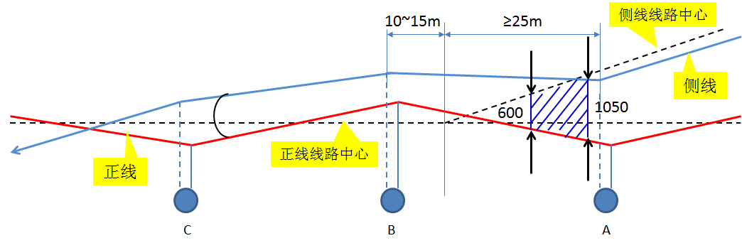 (1)在开口方向第一个道岔柱(A 柱)处两接触线等高,允许偏差为侧线比正线高0~20mm,侧线定位点距离正线(直股)线路中心大于1250mm。