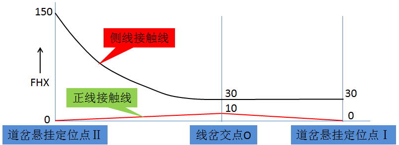 7)立面要求:如图所示,在道岔定位点Ⅱ处,正线股道接触网高度为标准导高,侧股接触线高度适当抬高30mm(对Re250,侧股接触线抬高150mm);线岔交叉点O处,侧线接触线在正线接触线之上,侧股接触线抬高30mm,正线接触线高度为标准导高(对Re250,正线接触线抬高10mm);在悬挂定位点Ⅰ处,侧线接触线抬高30mm,直股接触线高度为正常值。