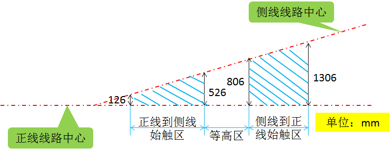 (1)在两线路中心线线间距126mm至526mm之间为第一始触区,在此区内渡线接触线比正线接触线高H1;