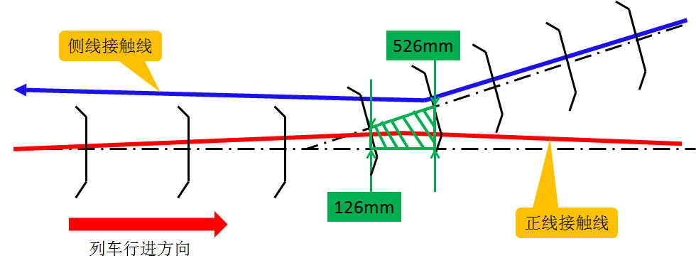 当机车从正线进入侧线时,在线间距126~526mm间为受电弓与侧线接触线的始触区,如图所示,此时,因侧线接触线被抬高下锚,侧线接触线高于正线接触线,过岔时,侧线接触线比正线接触线高度以-3/1000坡度降低,因而,受电弓可以顺利过渡到侧线接触悬挂。