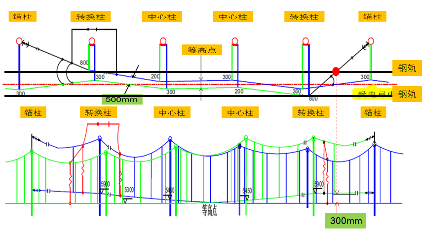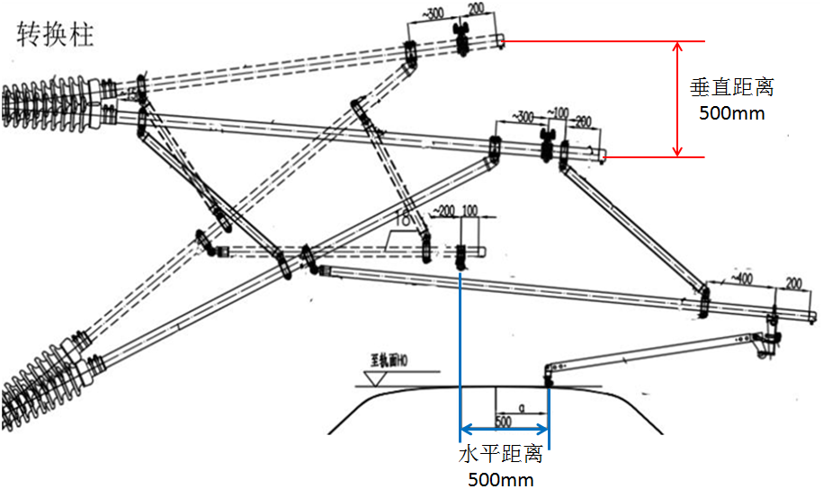 4、转换柱处绝缘子串与悬挂点的距离符合设计要求,允许偏差±50mm。承力索、接触线两绝缘子串上下应对齐,允许偏差±100mm。