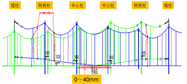 五跨锚段关节中间跨为过渡跨,接触线等高点(屋脊处)宜在过渡跨跨中,高度比相邻定位点抬高040mm