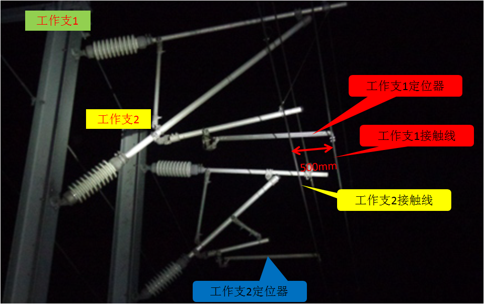 3、两接触悬挂接触线工作支过渡处接触线调整符合运行要求。