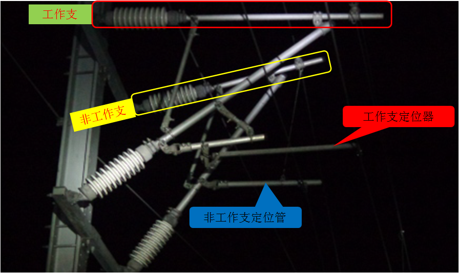 8、中心柱处,反定位管的根部可适当抬高,以保证反定位管与另一支接触线的绝缘距离。采用T型定位器或T型软定位器,在调整接触线拉出值的同时,应保证定位器对另一支接触线的绝缘距离。