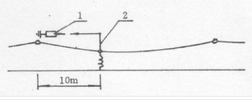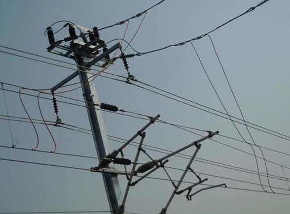 为了实现当接触网上有大气过电压时能通过避雷器直接接地,避雷器和接触网之间安装了电连接,电连接线的一端用电连接线夹固定在棒式绝缘子下面的连接板上,另一端用电连接线夹固定在线路方向距避雷器10m的接触网上。避雷器电连接如图所示。