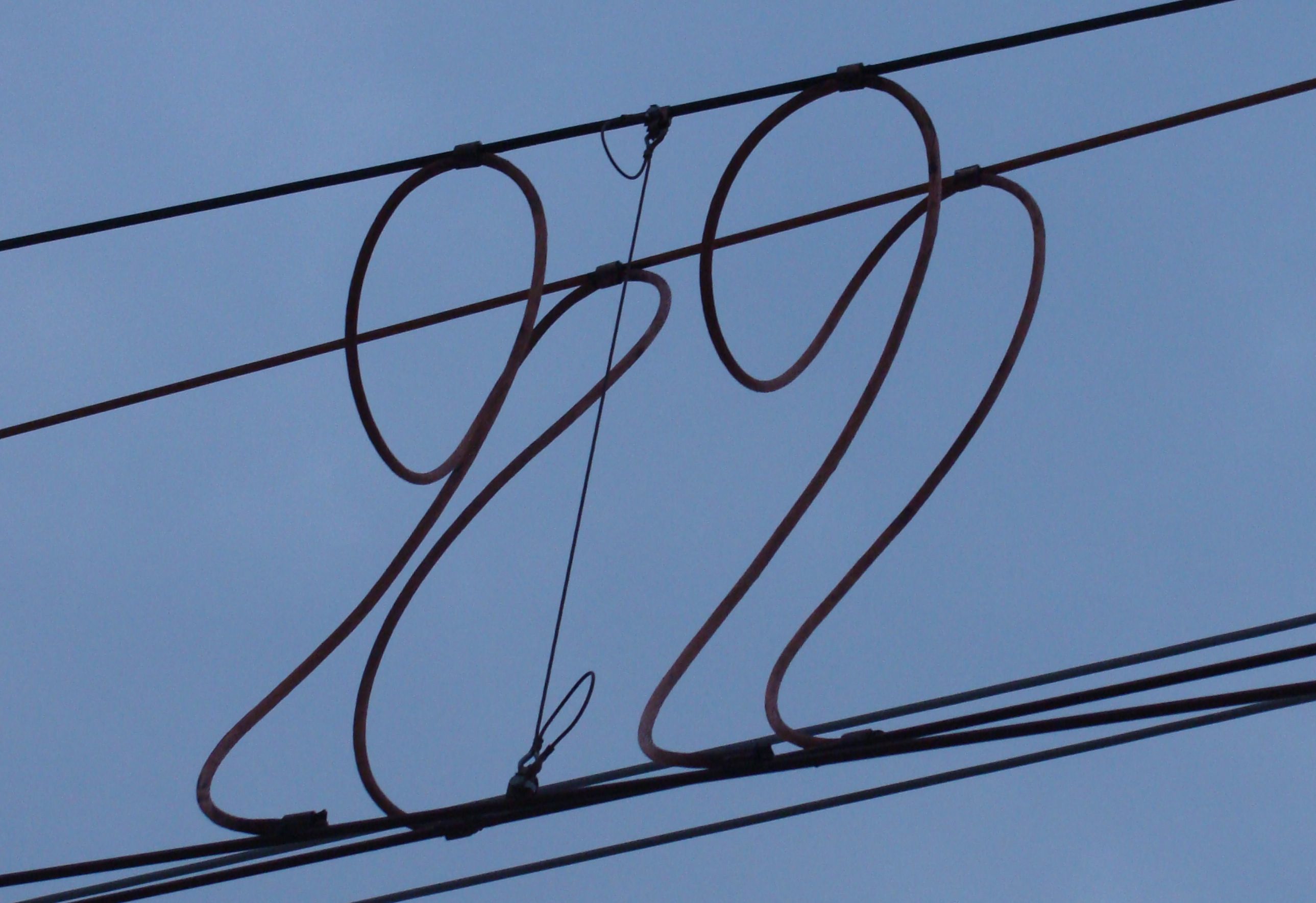 这种电连接是承力索和接触线之间的连接。横向电连接的主要作用是实现并联供电,起到等位和或分流的作用。如在载流承力索区段,为使承力索上的电流通过接触线流向受电弓,需要每隔100~200m在承力索与接触线间安装一组横向电连接,如图所示。