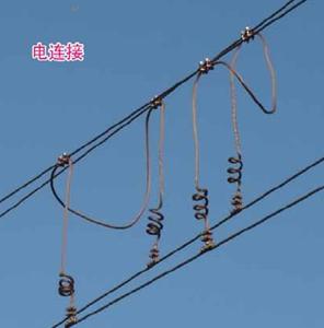 电连接线用导电性能好的材料制成,多采用铜绞线TJ-95和铝绞线LJ-150。为保持电连接处的弹性和接触良好,减轻硬点,电连接线做成螺旋弹簧状,以增加安装处所的弹性,并便于烧损后伸长使用,以便节约材料。电连接安装如图所示。