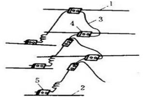 1—承力索;2—电连接线;3—接触线;4—承力索电连接线夹;5—接触线电连接线夹