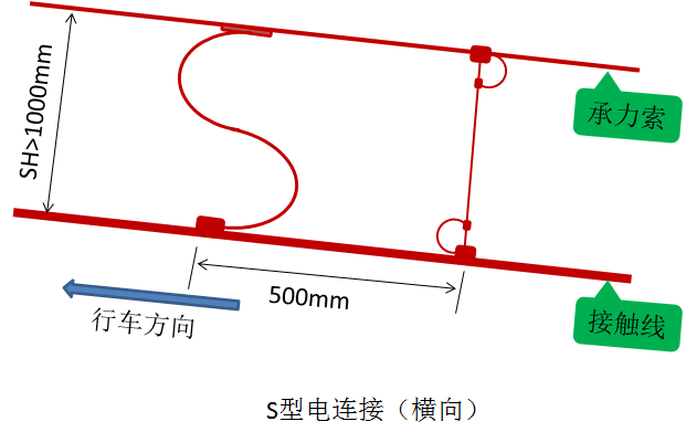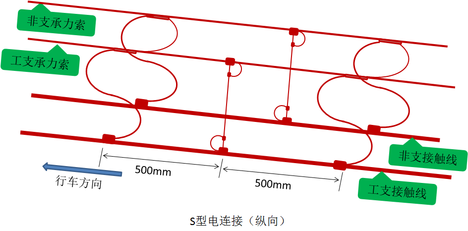纵向电连接的作用是使供电分段或机械分段处两侧接触悬挂实现电连通,在检修和事故处理时,可通过隔离开关达到电分段的目的。被连接的设备属于串联关系,如该电连接不存在,后端设备将失电。如锚段关节转换柱靠锚柱侧安装的电连接,电分段处隔离开关与接触悬挂间的电连接,线岔处的电连接等都称为纵向电连接。