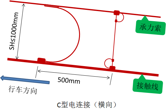 2)承力索、接触线间距≤1000mm时采用“C”形连接的方式;间距>1000mm时采用“S”形连接,其裕度满足接触线、承力索因温度变化伸缩的要求。