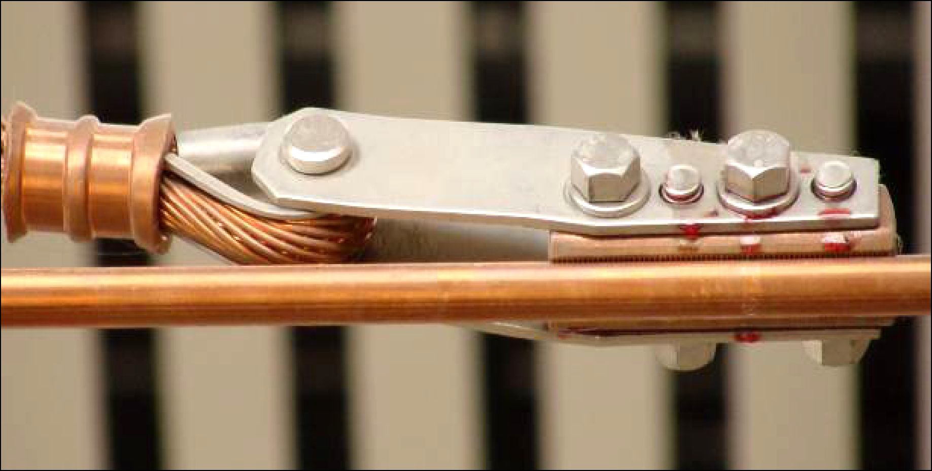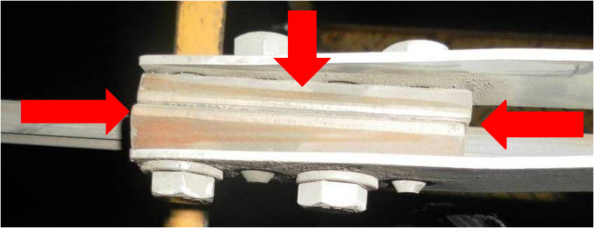 2、检查接触线、承力索中心锚结线夹状态,外观状态检查:线夹本体及螺栓、销钉有无滑移、损伤、变形、裂纹、烧伤或其他不良状态,开口销是否缺失、安装不正确,螺杆是否有弯曲。接触线中心锚结线夹与接触线沟槽密贴入槽。另外,特别注意检查承力索中心锚结线夹处承力索状态,检查方法同弹吊。检查要求采用三视法: