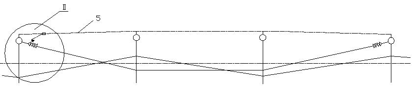 半补偿中心锚结辅助绳采用GJ—50镀锌钢绞线(19股)制成,辅助绳中间用中心锚结线夹与接触线固定。当一侧接触线断线后,另一侧接触线在中心锚结辅助绳的拉力下,不发生松动现象,起到了缩小事故范围的作用,其结构形式如图所示。