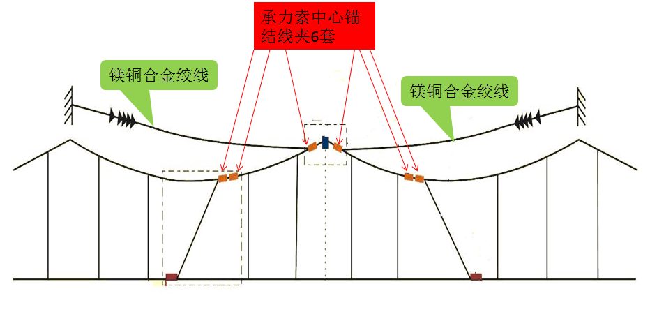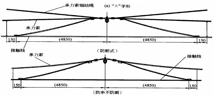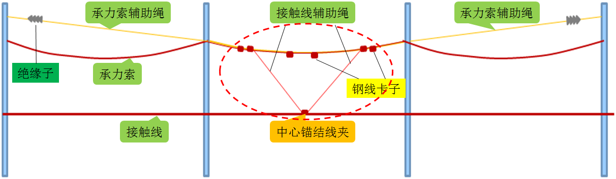 二跨式中心锚结固定方式同三跨式中心锚结一样,由接触线中心锚结和承力索中心锚结两部分组成。接触线的中心锚结辅助绳采用不锈钢软绞线(截面积不小于50mm2),在定位点两端用专用的中心锚结线夹与接触线固定(中心锚结绳与中心锚结线夹压接连接)。而承力索的中心锚结材质和型号选用与所在的承力索相同,通过在接触线中心锚结所在的跨距内增加一根承力索,在该定位点的腕臂上固定后,使该跨距的承力索不产生移动,因此承力索中心锚结由两个跨距组成。承力索辅助绳固定在定位点两端支柱上,安装时辅助绳应抬高锚固,一般不低于承力索高度,如图所示。