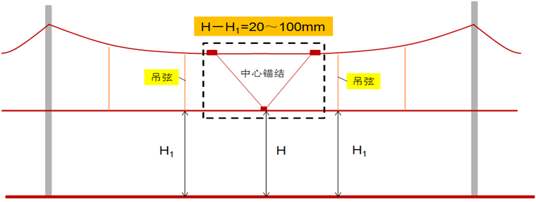中心锚结绳弛度应等于或略高于该处承力索弛度,承力索中心锚结绳在其垂直投影与线路钢轨交叉处,应高于接触线300mm 以上。