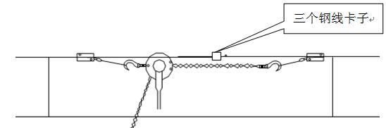 2)在楔形紧线器套子上挂钢丝套,将双钩紧线器的双钩与楔形紧线器上的钢丝套挂劳,紧动双钩紧线器(或手扳葫芦)使承力索充分松弛后停止紧线,然后确认紧线工具受力可靠、无滑动现象后,绑扎端口两侧,用断线钳切断承力索。