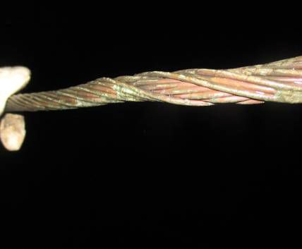 铝包钢承力索是铝覆钢线和铝线铰合而成,主要以铝覆钢线中的钢芯部分承受张力,覆铝层和铝线载流,导电性能好,机械强度和抗腐蚀性能较好。常用规格有GLZ类型。铜包钢承力索外形如图所示。