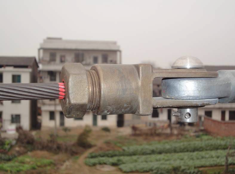 6)将大铝楔子前移压在小钢楔子周围的铝线上,用手拉紧,然后将锥筒螺栓套在楔子上,一人用手把住锥筒螺栓,同时拉紧承力索,使楔子同承力索一起进入锥筒螺栓,且楔子与承力索之间不再滑动。