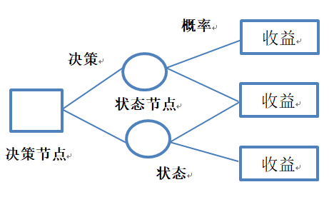 (3)决策树法。就是利用图形选择最优方案的方法,其特点是层级清楚、方便快捷、形象地显示决策过程。图中的方块是决策节点,由决策节点引出若干条直线,每条直线代表一个方案称为决策枝。图中的原点是状态节点,由状态节点引出若干条直线代表可能发生的状态,成为概率枝。概率枝末端为每个方案在各该状态下的收益值。其画法是由左向右,由简入繁,根据问题的层次构成一个树形图。