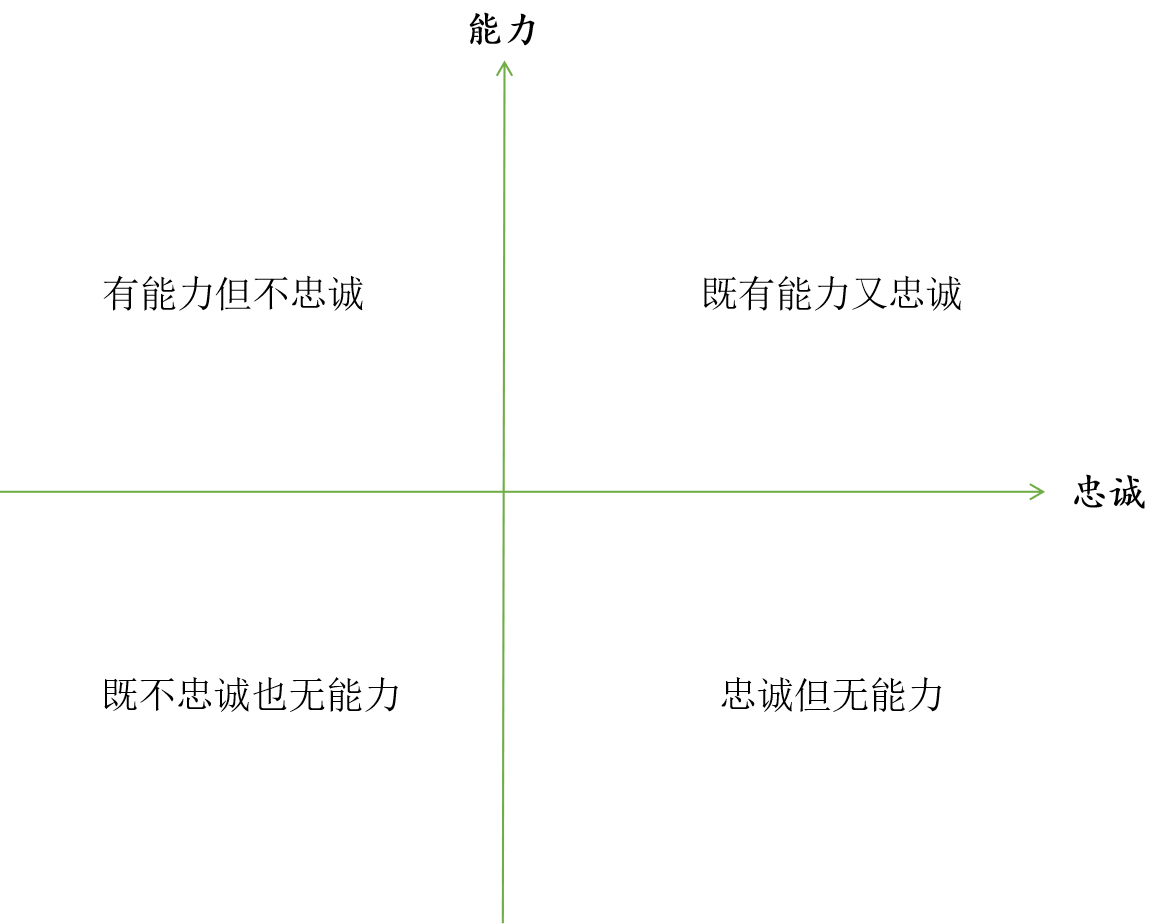 同样在人才管理上,究竟是“任人唯亲”还是 “任人唯贤”一直存在争议:在能力与忠诚的四象限图中,既不忠诚也无能力是必须否定的,但另两类人往往是两难:忠诚但无能力、有能力但不忠诚的人则需要具体对待。