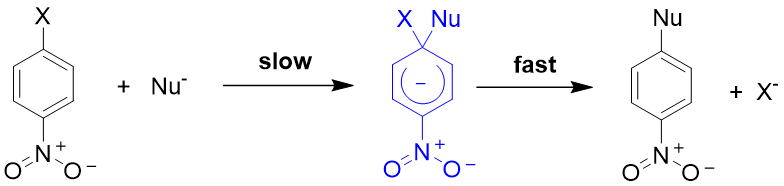 双分子反应,取决于进攻试剂的亲核性和芳香化合物的亲电性