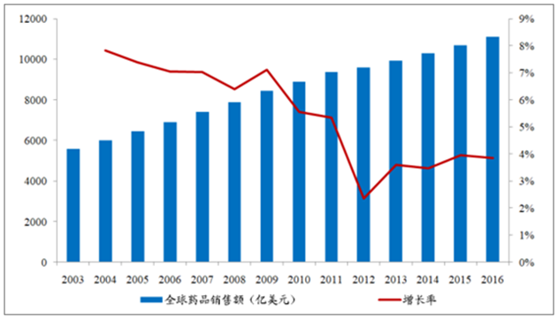 2016 年全球药品市场规模11100 亿美元,同比增长3.8%。