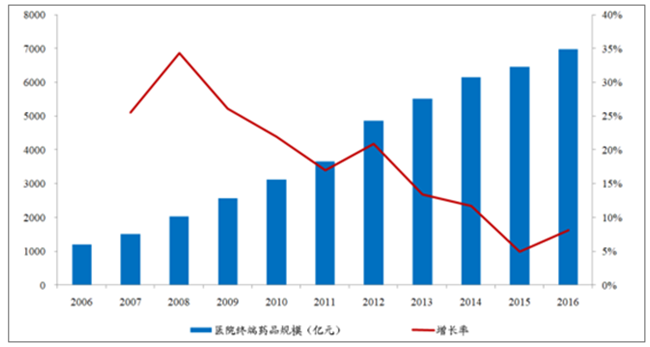 我国医院终端药品市场规模为 6975 亿元,同比增长8.1%。