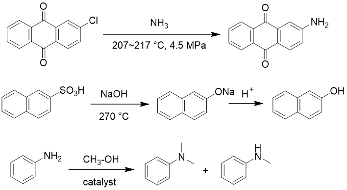 硝基还原反应、氨解反应、磺酸基碱熔反应、N-烷基化反应