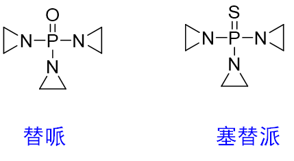 氮芥类药物是通过在体内转变成乙撑亚胺中间体发挥烷化剂作用,乙撑亚胺的磷酰胺衍生物,可提高抗肿瘤作用及减小毒性,用于临床的例如替哌(Tepa)用于治疗白血病。塞替派(Thiotepa)在体内代谢成替哌而发挥作用,临床用于治疗乳腺癌、卵巢癌、膀胱癌等。