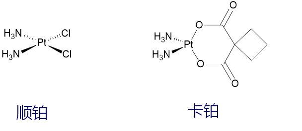 为减小毒副反应,发展了第二代铂配合物抗肿瘤药,例如 卡铂(Carboplatin)的肾脏毒性、神经毒性较顺铂低,骨髓抑制相等或略高。