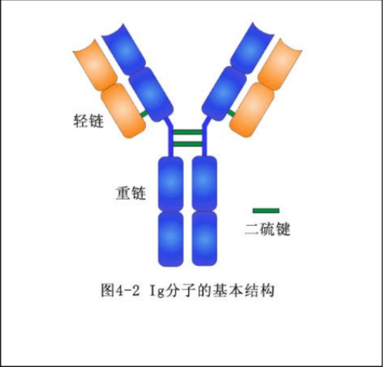 X 射线晶体衍射结构分析发现,免疫球蛋白由四肽链分子组成,各肽链间有 数量不等的链间二硫键。结构上 Ig 可分为三个长度大致相同的片段,其中两个 长度完全一致的片段位于分子的上方,通过一易弯曲的区域与主干连接,形成 一”Y”字型结构(图4-2),称为 Ig 单体,构成免疫球蛋白分子的基本单位。