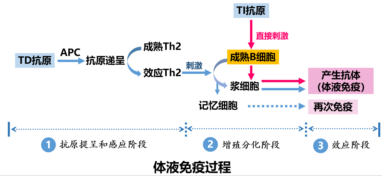 体液免疫应答:指B细胞在抗原刺激下分化增殖为浆细胞,浆细胞合成并分泌抗体,由抗体发挥特异性免疫效应的过程,因抗体存在于血清等各种体液中,因此成为体液免疫应答。刺激B细胞产生免疫应答的抗原有TD-Ag(胸腺依赖性抗原)和TI-Ag(胸腺非依赖性抗原),二者的作用机制不同。现分别叙述如下。