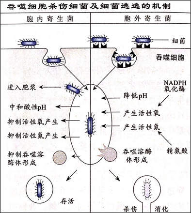 胞内寄生菌进入细胞之后能够躲避抗体和补体的攻击,使体液免疫应答难以发挥效应。更为重要的是,胞内寄生菌能够抵御吞噬细胞的胞内杀伤机制(如下图)。在胞浆或者吞噬体内的长期存在对巨细胞构成强烈的刺激,使其分泌大量的细胞因子(如IL-1、IL-12和IL-18等)和各种炎症介质。L-12和L-18促进Th细胞向Th1分化,使胞免疫应答向Th1偏移。L-12和L-18还具有激活NK细胞的作用。Th1和NK细胞通过它们分泌的IFN-γ进一步激活巨噬细胞,使其进入亢奋状态,三者之间形成正反馈激活环路,加大免疫应答的强度。因此,针对胞内生寄生菌,尤其是分枝杆菌(如结核杆菌)的免疫应答往往导致较为严重的Ⅳ型超敏反应,甚至可以形成慢性肉芽肿结节。应该指出,所有的病原微生物感染均同时诱导体液和细胞免疫应答,只不过不同病原微生物所诱导反应的侧重不同。