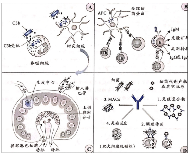 组织中的DC吞噬细菌碎片或者抗原后迁入引流淋巴结并在那里激活T细胞(上图A、B、C)。细菌碎片或者其代谢产物经补体致敏后随淋巴液进入引流淋巴结,进而在Th细胞的辅助下激活B细胞(上图B)。活化的CD4+Th细胞随血液循环进入外周组织和器官。局部组织中被活化的肥大细胞可分泌IL-4,使得免疫应答向Th2偏移。B细胞产生针对感染细菌的抗体,随血液循环运输至全身。特异性抗体可以中和细菌毒素,还能够激活补体、诱导肥大细胞和嗜酸性粒细胞的活化与脱颗粒反应(上图D)。分泌型IgA抗体能够阻断细菌对黏膜表面的黏附。