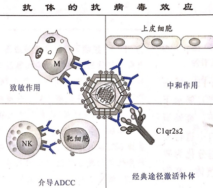 抗体在抗病毒感染中具有十分重要的作用(如下图)。首先,抗体与病毒表面蛋白质的结合可以阻断其与细胞表面受体的接触或者干扰病毒向细胞内的侵入,黏膜表面的IgA分子在这方面的作用尤为重要。其次,抗体分子结合病毒后通过激活补体导致病毒体的裂解,在此过程中产生的C3a和C5a等补体片段可趋化白细胞。抗体还能够有效地致敏病毒颗粒,使其更容易被吞噬细胞所识别和吞噬。有些病毒膜蛋白能够表达于宿主细胞的表面。病毒特异性抗体通过对这些病毒蛋白的识别而“标记”被感染细胞,诱发补体或者NK和巨噬细胞对这些细胞的杀伤。