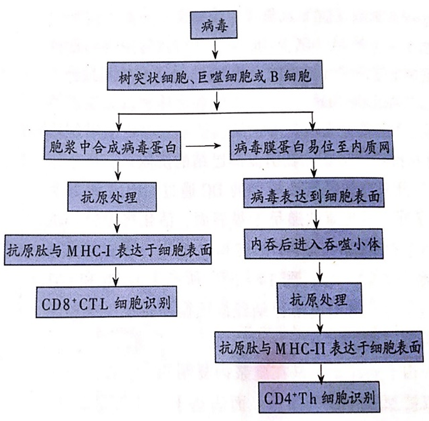 由于病毒蛋白是在胞浆内复制的,病毒抗原肽可以被MHC-Ⅰ分子递呈。而表达于细胞表面的病毒体或者蛋白经内吞后进入MHC-Ⅱ抗原递呈途径。因此,病毒感染通常能够诱导较强的CTL和Th细胞反应。宿主初次感染3-4天之后外周开始出现病毒特异的CTL和Th细胞,7-10天时达到高峰。局部组织中的APC通过递呈病毒抗原肽激发CTL和Th细胞发挥免疫效应。Th细胞分泌更多的细胞因子,加强免疫应答。CTL迅速消灭被病毒感染的细胞,消灭病毒赖以藏身之处和复制“工厂”。