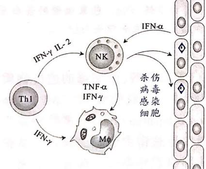 通过释放TNF(肿瘤坏死因子)、IFN等物质,可直接杀伤靶细胞(病毒感染细胞,细胞膜发生变化,被NK细胞识别),还可激活巨噬细胞。(如右图)