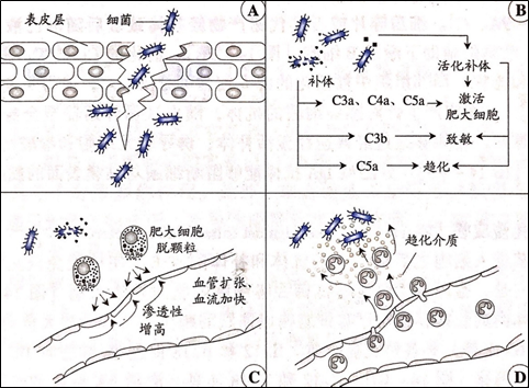 穿过体表或者黏膜层的细菌首先可能激活补体而被裂解(下图A)。补体活化后产生的C3a和C5a片段参与激活肥大细胞并趋化其它炎症细胞(下图B)。此外,细菌及其产生的毒素对神经未稍、肥大细胞和巨噬细胞均构成强烈的刺激,有可能直接导致肥大细胞脱颗粒,启动局部的炎症反应(下图C)。在各种趋化介质的作用下,血液循环中的中性粒细胞和单核细胞浸润感染局部,吞噬并消化入侵的细菌(下图D),非特异性免疫应答在细菌感染的早期控制细菌的快速增殖,有时在特异性免疫应答启动之前就已经将入侵的病原微生物清涂,但多数情况下需要特异性免疫系统的参与才能实现这一目标。
