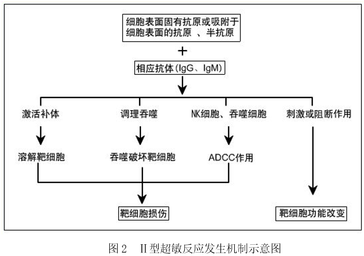 Ⅱ型超敏反应是由IgG或IgM类抗体与靶细胞表面相应抗原结合后,在补体、吞噬细胞和NK细胞参与作用下,引起的以细胞溶解或组织损伤为主的病理性免疫反应。