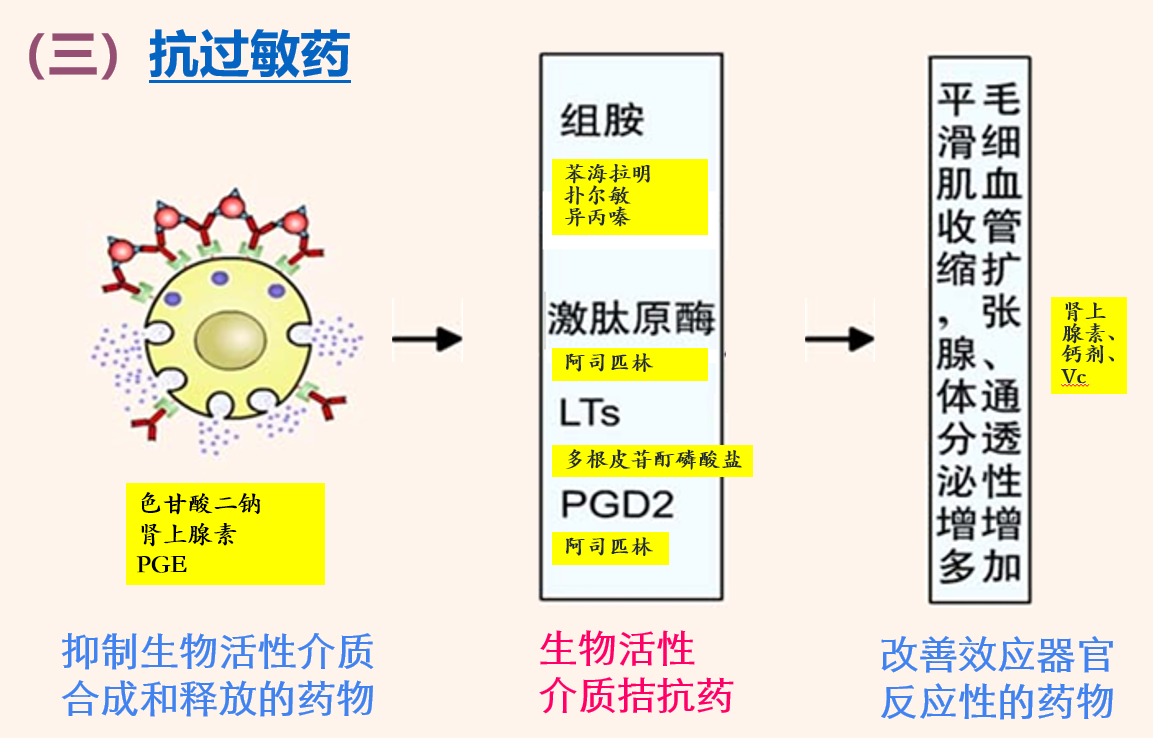 (1)抑制生物活性介质合成与释放的药物:阿斯匹林(乙酰水杨酸)能抑制白三烯、前列腺素的生成;色甘酸二钠能稳定细胞膜,阻止胞浆内颗粒的释放。肾上腺素、异丙肾上腺素、前列腺素E、甲基黄嘌呤、氨茶碱可促使cAMP合成或抑制其分解,增加细胞浆内cAMP浓度,抑制嗜碱颗粒的释放。