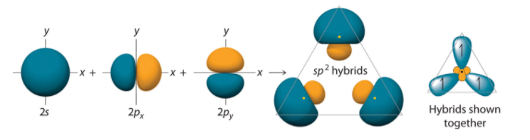 Figure: Formation of sp2 Hybrid Orbitals. Combining one ns and two np atomic orbitals gives three equivalent sp2 hybrid orbitals in a trigonal planar arrangement; that is, oriented at 120° to one another.