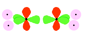The p orbitals on each carbon are not pointing towards each other, and so we'll leave those for a moment. In the diagram, the black dots represent the nuclei of the atoms. Notice that the p orbitals are so close that they are overlapping sideways.